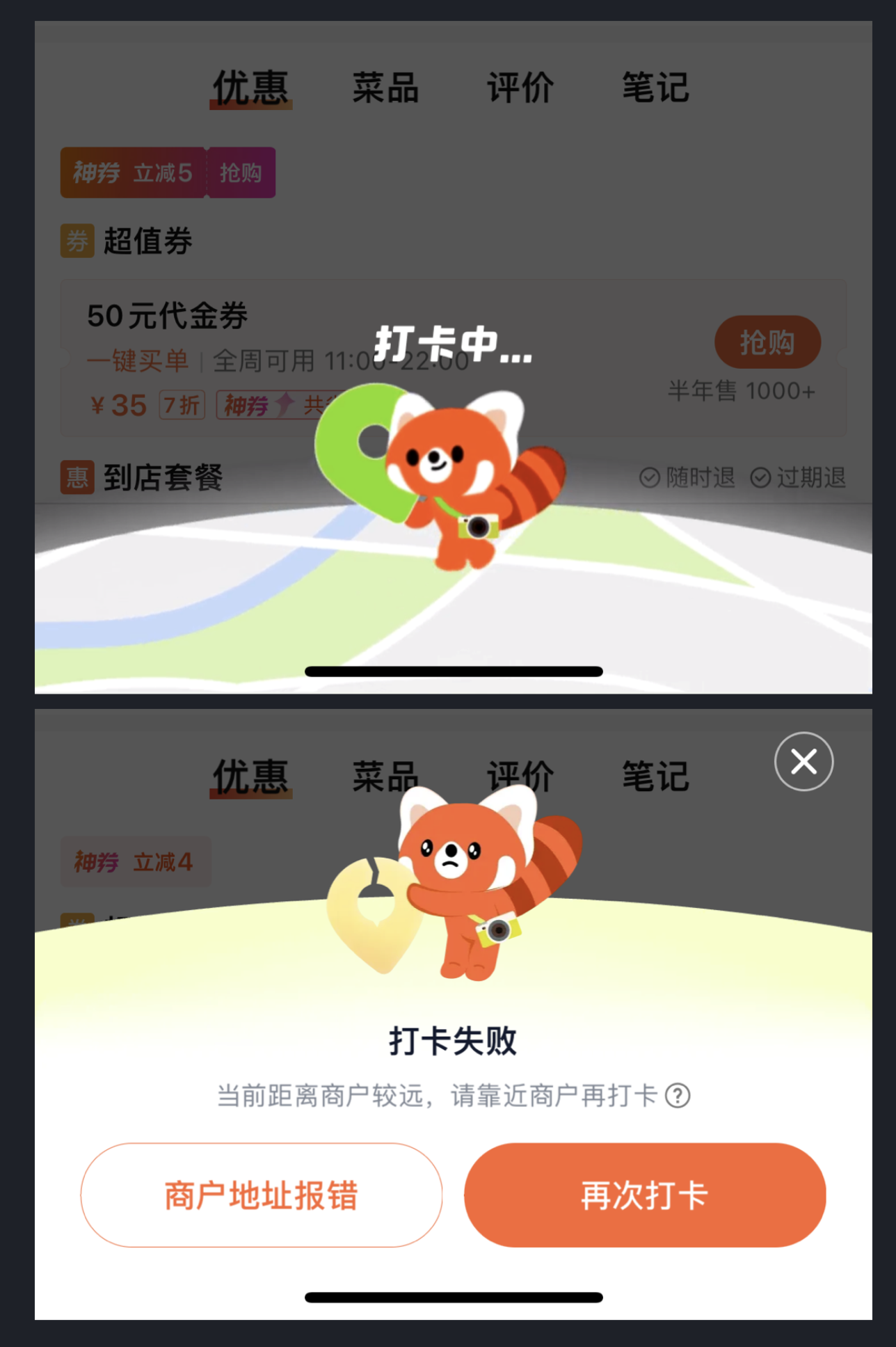 線下門店打卡活動早已普及,但如何提升打卡的體驗感?大眾點評 App 給出了答案:點擊打卡后,會觸發 IP 角色結合定位符號的動畫效果,生動傳遞 “到店” 的含義。同時,若用戶距離商戶過遠,會明確提示 “打卡失敗”,保證打卡的真實性。這種動態化的反饋讓打卡行為不再是簡單的按鈕點擊,而是充滿參與感的互動過程,既提升了用戶的參與意愿,又讓活動更具可信度。