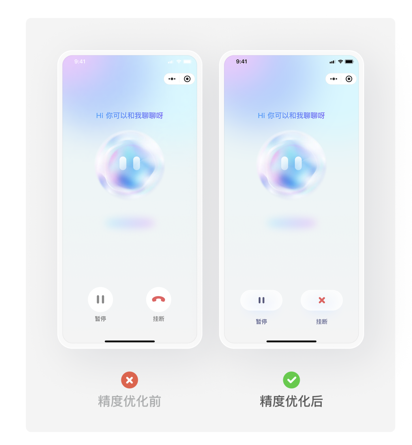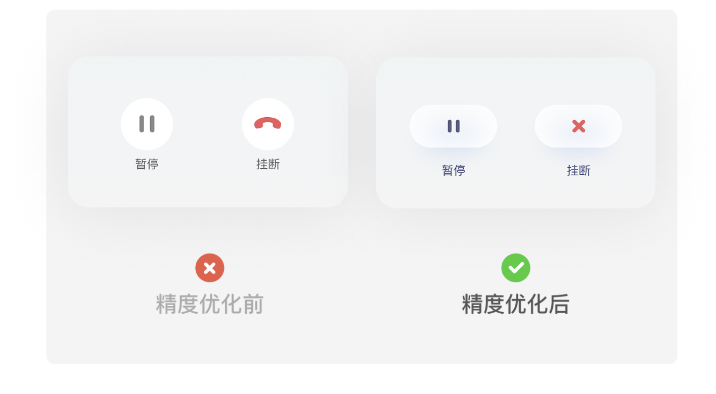 - 元素統(tǒng)一:檢查按鈕圖標(biāo)風(fēng)格,避免線性圖標(biāo)(如暫停的雙豎線)與面性圖標(biāo)(如掛斷的電話圖形)混用。統(tǒng)一采用線性圖標(biāo),確保線條粗細(xì)一致,讓視覺風(fēng)格更統(tǒng)一。