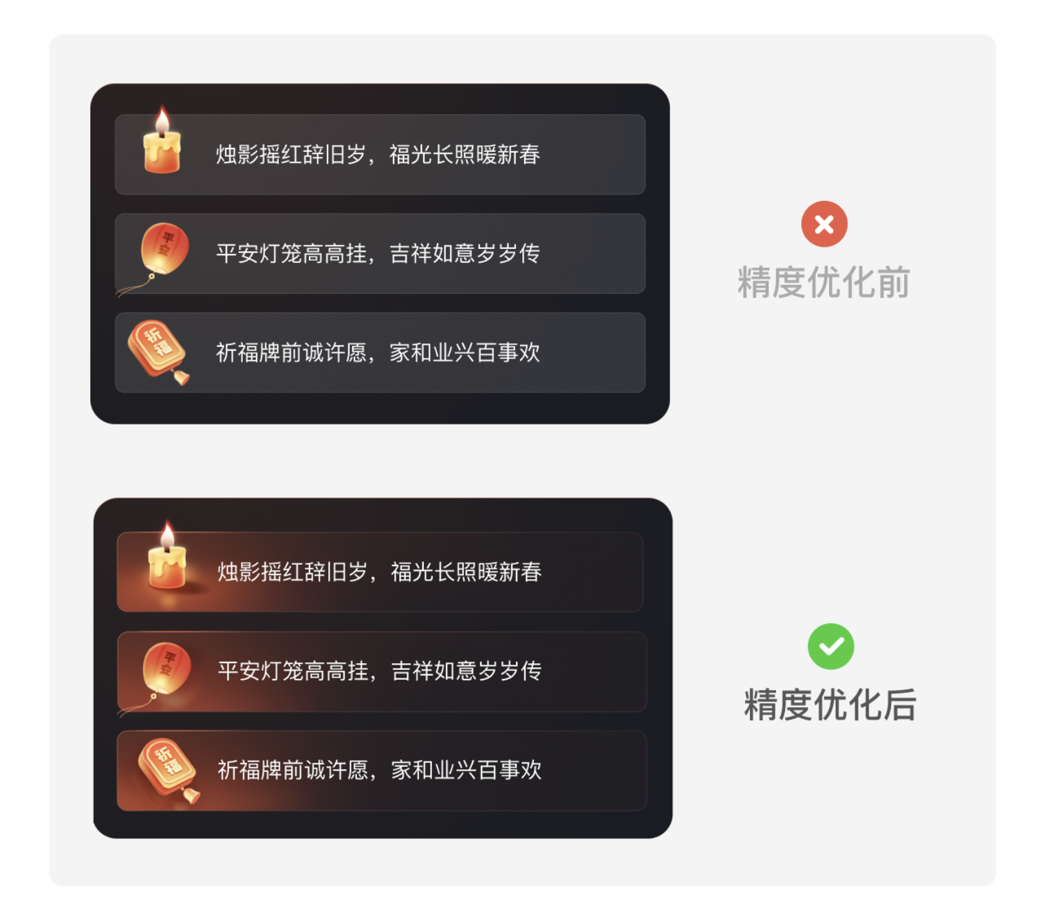 - 色彩呼應(yīng):讓容器、描邊、圖標(biāo)保持同色系,避免色彩雜亂。比如新春祈福卡片,圍繞紅色主題展開,從容器漸變到圖標(biāo)投影,都采用紅色系變化,強(qiáng)化主題氛圍。