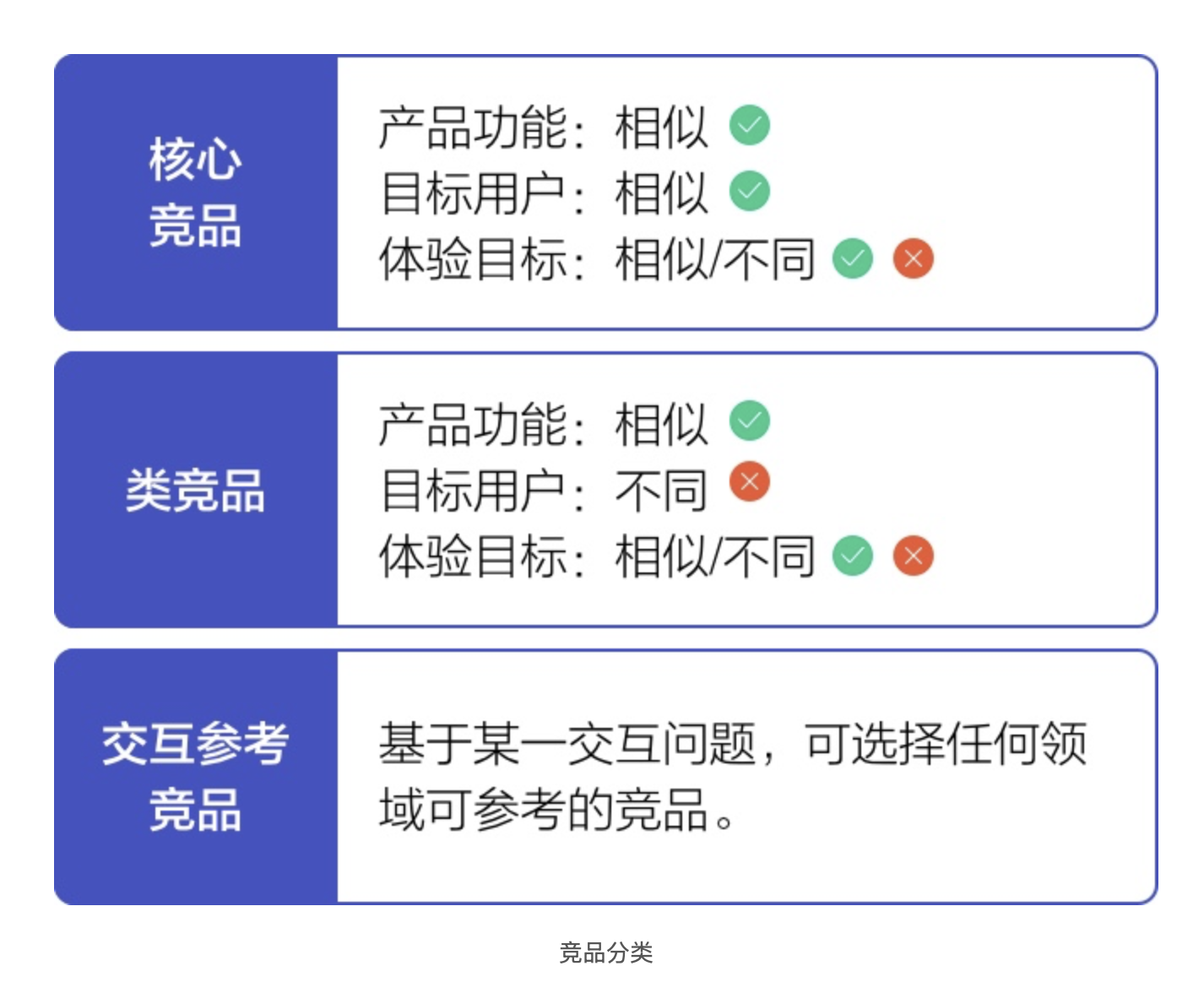 根據(jù)分析目標(biāo),可將競品分為三類,按需開展針對性分析: