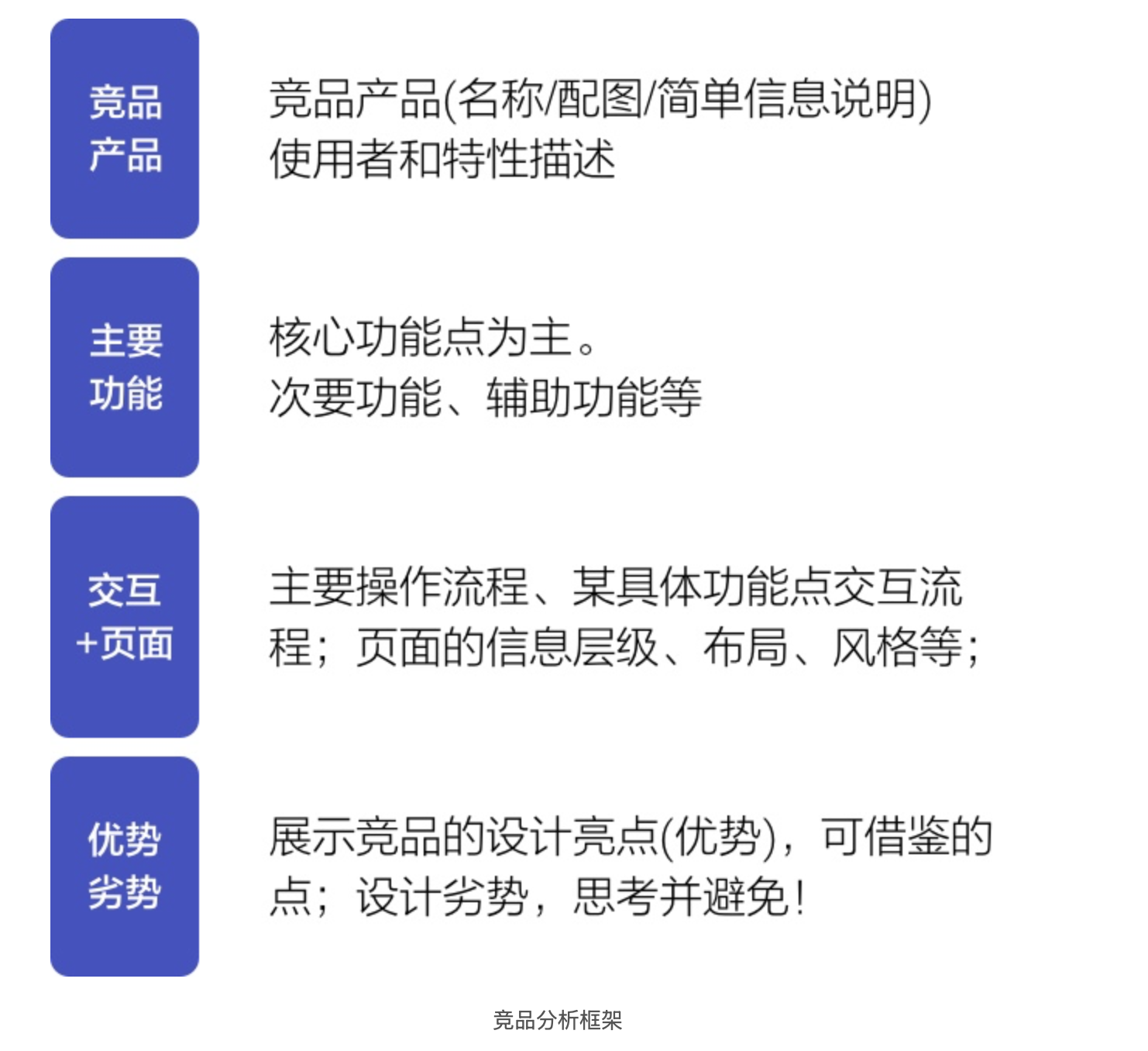 競品分析的核心是 “結(jié)構(gòu)化呈現(xiàn) + 深度洞察”,而非簡單的信息堆砌。需建立清晰的分析框架,從產(chǎn)品本質(zhì)到設(shè)計細(xì)節(jié)逐層拆解,最終形成可落地的設(shè)計建議。