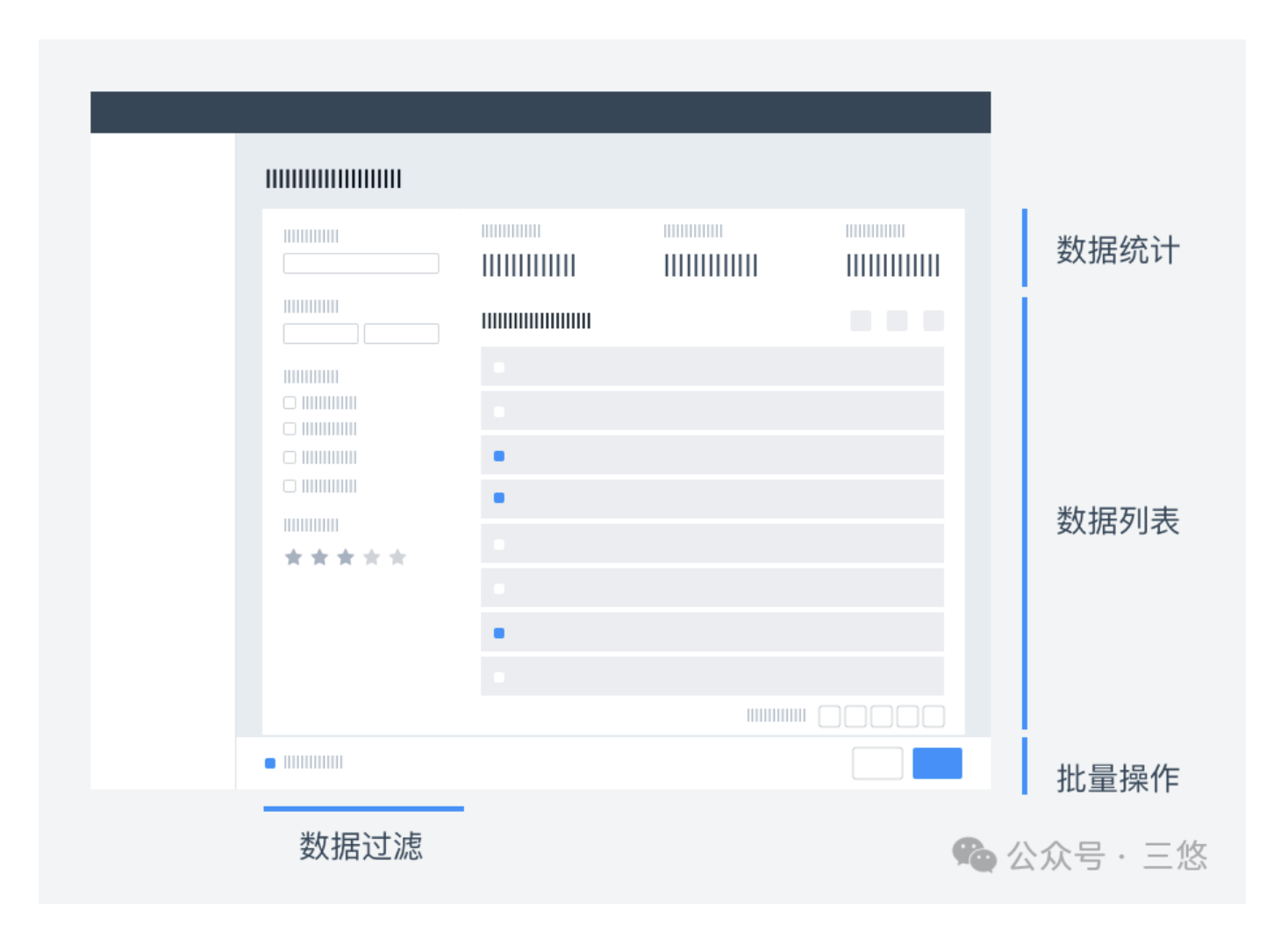 雙欄布局將數(shù)據(jù)過濾模塊單獨置于左側(cè)側(cè)欄,右側(cè)展示數(shù)據(jù)統(tǒng)計與數(shù)據(jù)列表,適合過濾條件較多的場景,既能保留完整的篩選功能,又不影響數(shù)據(jù)展示區(qū)域的完整性。