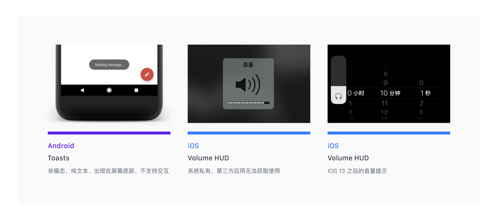 - 使用場(chǎng)景:通知操作結(jié)果(如 “保存成功”“加載失敗”)、短暫狀態(tài)提示(如 “音量調(diào)節(jié)”)。
