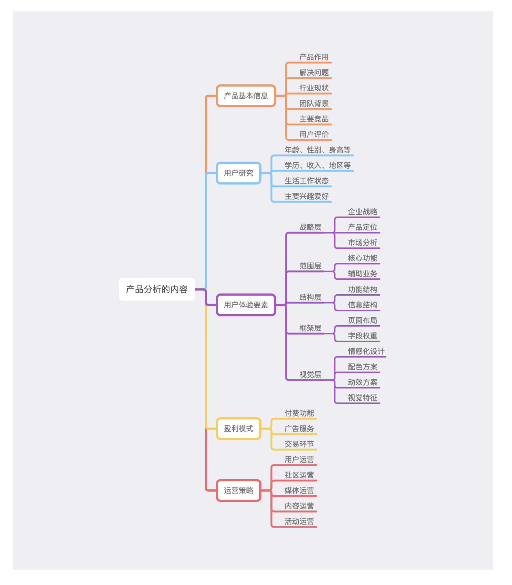 基于基礎信息,從 “用戶研究→用戶體驗五要素→盈利模式→運營策略” 四個核心維度展開分析,每個維度都需緊扣前期設定的目標。