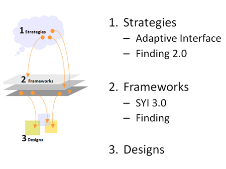 你可以從中看到自己的影響力到哪,一個(gè)設(shè)計(jì)師如果是精于designs,那你是個(gè)很好的設(shè)計(jì)助理,如果能能對frameworks提出成熟方案,那應(yīng)該是個(gè)很合格的交互設(shè)計(jì)師了,如果你對strategies有影響,甚至有一定決策權(quán),那恭喜你,你理所當(dāng)然應(yīng)該得到所有HCIer的尊重。