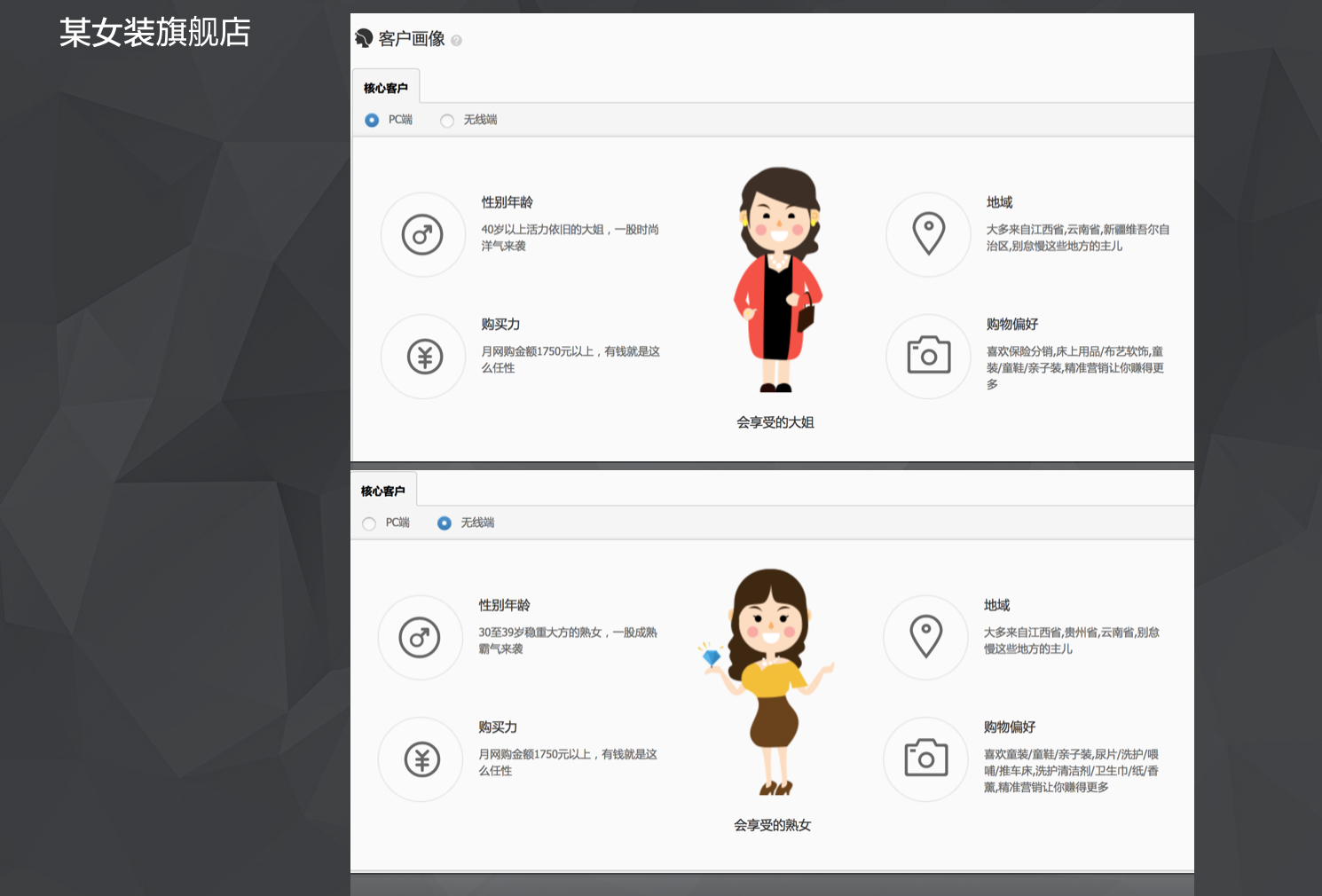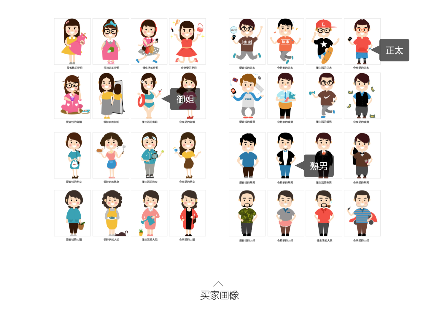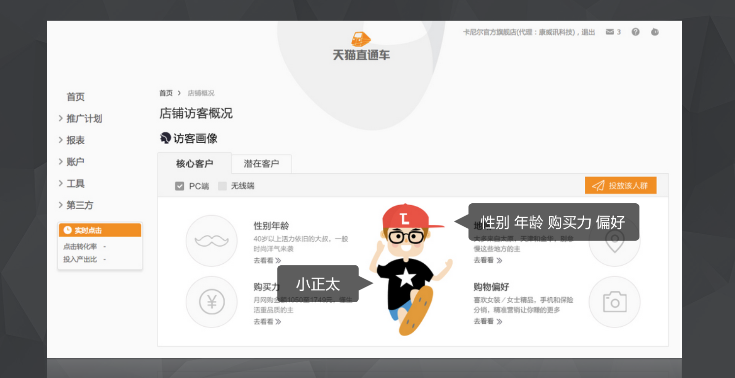 通過購買力,性別,年齡,偏好4個緯度來將訪客劃分為不同的類型,用手繪的形式來代替文案,讓用戶在短時間內更容易的了解到到店訪客的情況。