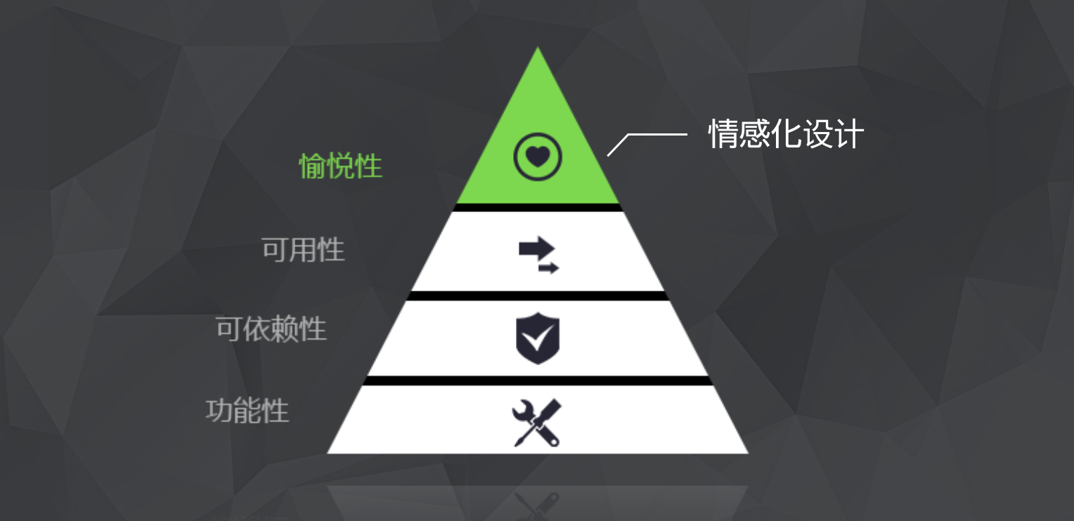 《情感化設計心理學中》作者唐納德·諾曼將情感化設計與馬斯洛的人類需求層次理論聯系了起來。 產品特質也可以被劃分為功能性、可依賴性、可用性和愉悅性這四個從低到高的層面,而情感化設計則處于其中最上層的“愉悅性”層面當中。
