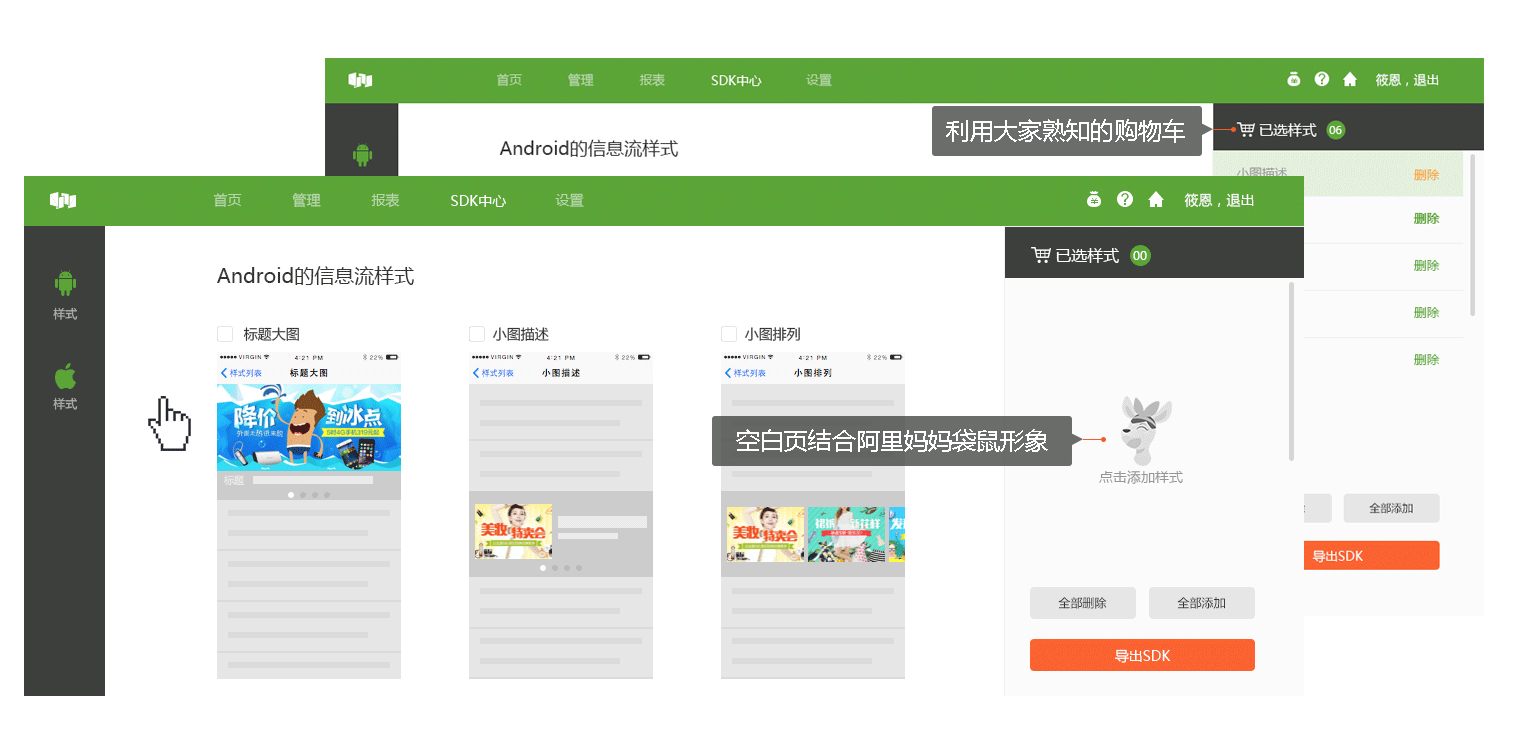 在新品介紹中加入了阿里媽媽袋鼠的品牌形象,一方面做到了,品牌的滲透。阿里媽媽袋鼠吉祥物在PC產品端落地的,另一方面可以通過帶有表情的卡通形象,傳達給用戶相關的信息。
