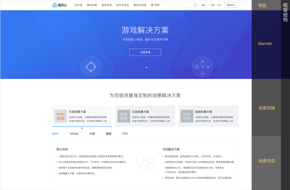 (如下圖所示為常見網頁形態結構,整個頁面UI開發同學需要得到的其實是設計師確認的框架結構,至于里面的圖標、banner配圖、抑或是文字內容都是可以后面提供的。具體來說,如下圖中,場景切換部分為三分陣列版式,灰色方框為圖標占位預留,UI開發同學只需要圖標占位尺寸即可,圖標細節和形態,設計師在后面完成整體頁面框架后-上線前補齊即可。)