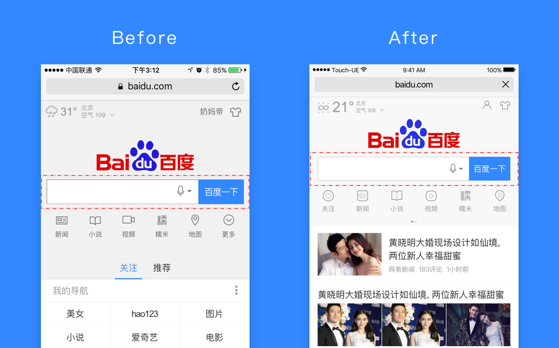 搜索導(dǎo)向-搜索入口的更好展現(xiàn)。搜索框作為發(fā)起搜索最直接的途徑,對它一點(diǎn)點(diǎn)的改變都是非常慎重的,在用戶對信息量需求激增的前提下,調(diào)整搜索區(qū)域與信息區(qū)域的占比變得尤為重要。運(yùn)用黃金比例,將搜索框定位在一個(gè)最優(yōu)的比例上,同時(shí)保證信息展現(xiàn)的最大化。搜索框區(qū)域提升,內(nèi)容區(qū)域展現(xiàn)更多,滿足資訊需求。