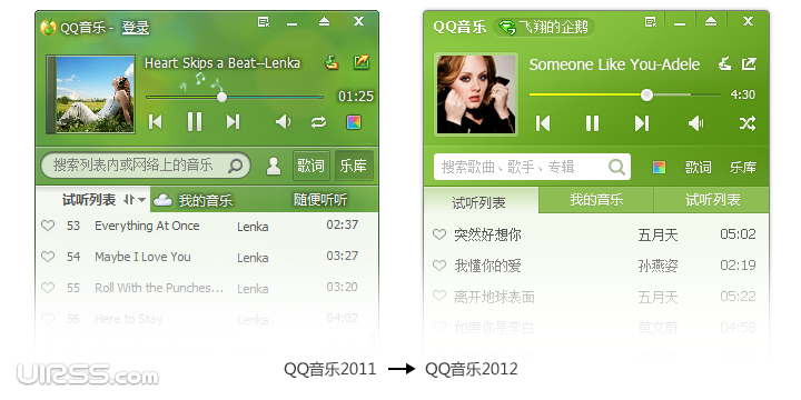 早在2011年7月,QQ音樂2011beta版的發布便確立了用品牌色–綠色,做為QQ音樂客戶端的默認顏色,綠色代表和平、希望、生長和環保,對QQ音樂的品牌形象有積極的正面意義,此外,縱觀競品,常見的客戶端配色多為黑和藍,用綠色也較利于提高產品的識別度。QQ音樂2012賀歲版的視覺,也是圍繞綠色和細節進行全面的體驗優化。項目從去年12月31號開始,進行了為期15天的設計和快速迭代。