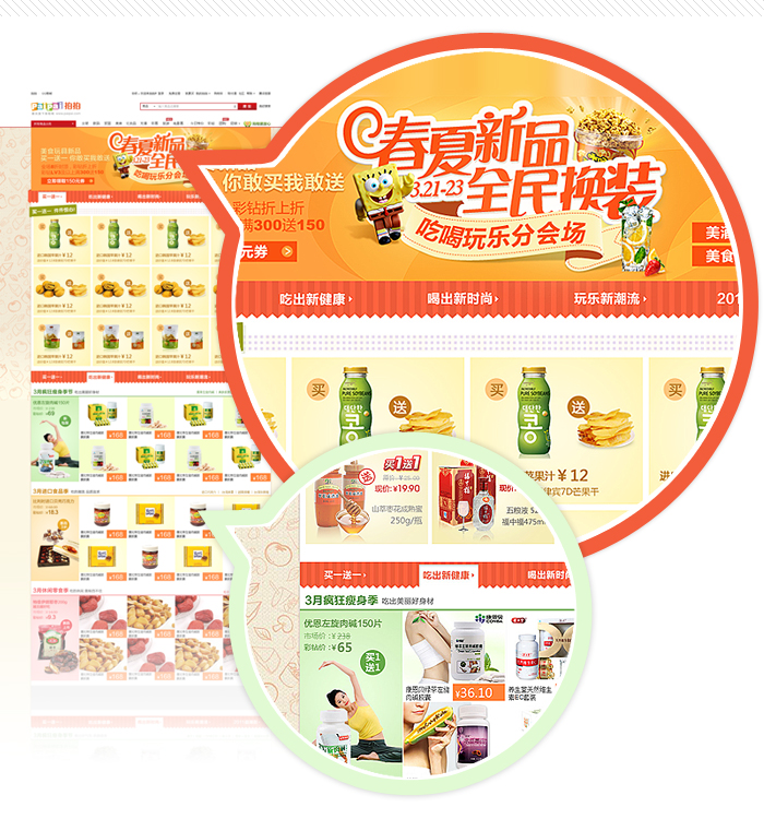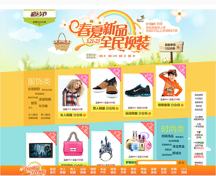 拍拍3月的大型促銷活動《春夏新品,全民換裝》,主會場設計上運用明快、鮮艷的春夏色彩塊組合,在細節上采用花朵草地藍天更加突顯初春購物的輕松氛圍。并在活動頭部主畫面中采用HTML5+CSS3實現的酷炫動畫,為用戶帶來了全新的頁面體驗。