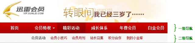 設計中使用近似的文本、顏色、圖像和留白等,可以更好的區分各個模塊。如下圖中迅雷會員導航,通過相似原則我們很容易的將一級導航和二級導航區分開來。