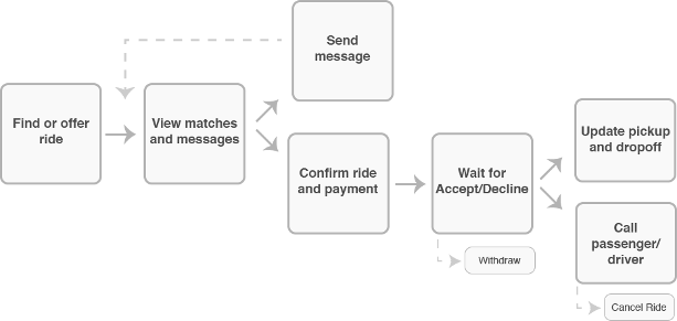 為此,我參考了其他一些協同消費 (Collaborative Consumption)類型的應用產品,例如Airbnb 和Yardsale 等等。在嘗試了多種流程及界面布局方式之后,我們決定采用一種輕量級的確認序列機制,它的操作界面類似于大家所熟悉的短消息界面。無論駕車者還是搭乘者都可以發起確認;例如,旅程結束后,一旦搭乘者完成了支付,駕車者收到款項,此次拼車活動就會被確認完成。