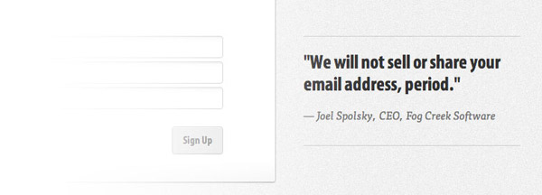 在為訪問者提供積極引導的同時,我們還要想辦法避免掉那些負面因素。人們在填寫表單時的最大顧慮就是信息被網(wǎng)站方收集之后的用途。用戶不會希望收到垃圾郵件,更不愿意自己的個人信息被傳播出去。如果你確實運營著一個值得信賴的產(chǎn)品,那么不妨直接讓用戶知道你不會把他們的信息販賣出去或是向他們發(fā)送垃圾郵件,就像FogBugz做的那樣,在注冊表單旁邊以非常直白的口語化的方式告訴用戶“我們不會出售或分享你的郵箱地址,就是這樣。”