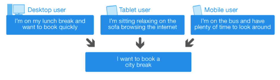過去,我們通常會假設用戶在使用移動設備訪問網站時,其行為都是高度目標驅動化的,例如在旅途中獲取酒店地址、預訂房間一類。但實際情況不僅如此——智能手機、平板電腦等各類移動設備的用戶,會越來越多的在相對穩定從容的狀態下使用網絡。所以在很多時候,用戶使用不同設備的目標差別并沒有想象的那么大,我們不能片面的假設不同類型設備的用戶對功能的需求差異。