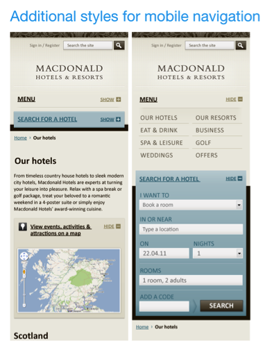 相比于傳統的Web視覺設計過程,在這里我們不僅要打造出風格恰當的UI元素,而且要根據前面制定下來的幾種規格方案,對某些關鍵性的UI元素進行樣式擴展或改造。例如下圖所示的酒店搜索模塊,正如我們前面提到的,在小屏幕版本中,最佳實踐方式是做成可展開和收起的模式,而這種交互方式在平板電腦或桌面設備中是不需要的。類似這樣情況,在視覺設計方面需要花些額外的功夫。
