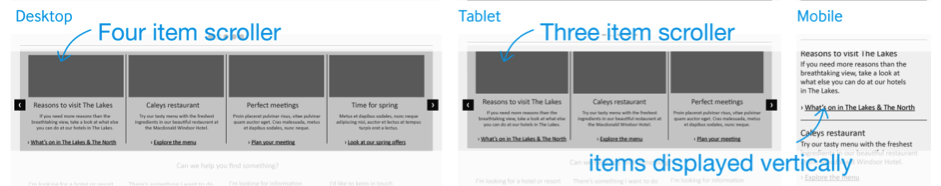 全局的四列等寬網格布局使其他組件的規劃也非常輕松。在首頁中有一個組件,其中包含若干內容模塊。默認尺寸下,可以并排顯示四個模塊;左右兩邊各有一個觸發滾動的按鈕,以點擊之后模塊列表會前后滾動,以顯示更多內容。在平板電腦類型的布局中,默認顯示的數量變為三個;而在手機的小尺寸屏幕中,內容模塊列表會變為單列,并去掉了用于左右滾動的按鈕,用戶可以上下滾動頁面,依次查看不同的模塊。