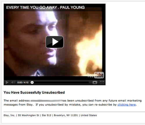Etsy 會在用戶退訂之后播放Paul Young的"Every Time You Go Away"。這種方式無法讓用戶留下來,但可以給他們留下深刻的印象。當用戶再一次在Etsy平臺上瀏覽商品時,多半會想起這個有意思的小環節,或許他們無論在哪里聽到這首歌的時候還會想到Etsy呢。