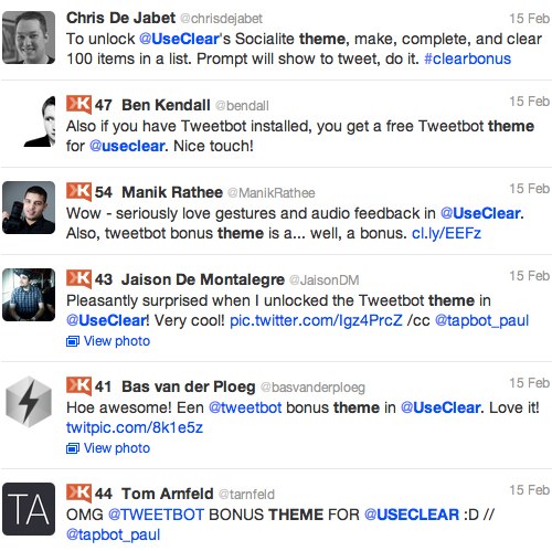 另外,如果你follow了Clear開發者的Twitter帳號,那么還能獲取另外一款獎勵主題。這個彩蛋的作用依然在于傳播。人們會分享他們的熱忱,甚至談論他們獲得或是錯過了哪些主題。