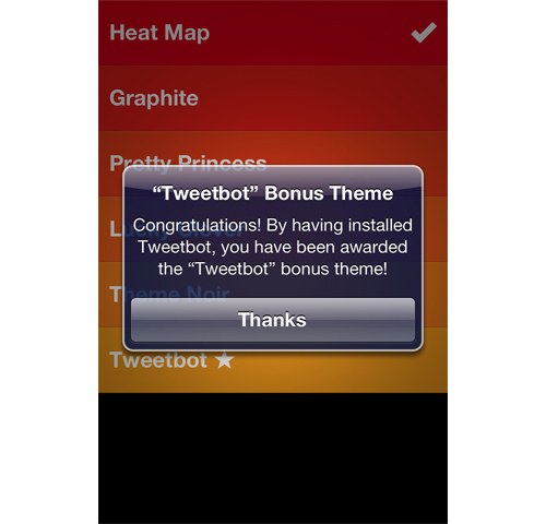 驚喜、專享 :在應用中打開主題設置界面后,安裝了Tweetbod的用戶會收到一條消息,恭喜他們獲得了專享的額外主題。這些用戶很可能因為受到了特殊照顧而感到開心,另外,這個群體在口碑傳播方面的作用是相當大的。