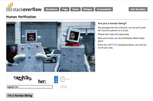 驗證工具Captcha在如今被很多網站所使用,但這不意味著用戶真的喜歡這東西,很多時候Captcha確實會令人感到煩惱和挫敗。我們暫時無法改變這個工具本身的工作機制,但至少可以像Stack Overflow那樣通過一幅有趣的圖片搭配說明文案,向用戶解釋為什么要使用這個煩人的工具,籍此獲得用戶的理解,減少負面情緒的產生。
