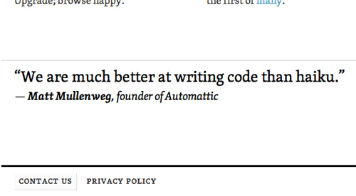 標語 :Automattic的標語之一是“比起俳句,我們更擅長寫代碼”。正是這種看似嚴肅認真的幽默感,或者說看似幽默的認真,奠定了他們的產品基調。