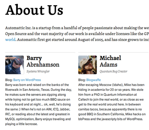 幽默 :在Automattic的“關于”頁面中充滿了和善幽默的自我介紹,感興趣的用戶在閱讀時就能感受到他們那種充滿樂趣的工作環境。