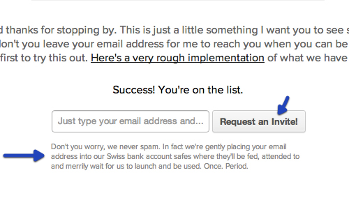 下面的范例來自我的一個個人項目,用戶需要邀請碼才可以試用這個產品。在提交申請的地方,我使用“我要獲取邀請!”來代替傳統的“提交”作為按鈕當中的文案,希望這可以調動起用戶的情緒,并使他們感受到一種更加真實、更加有針對性的互動。另外我也起草了一份簡單的說明文案,讓用戶放心,我們絕不會發送垃圾郵件。