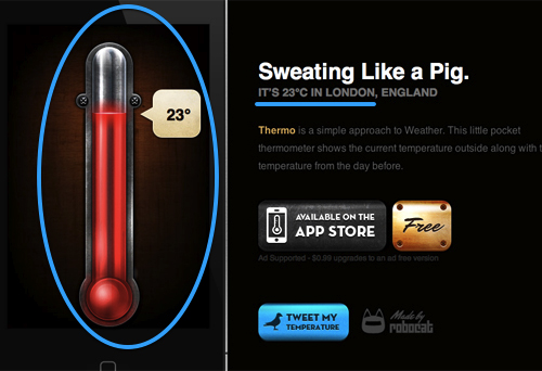 Thermo 應用的著陸頁可以判斷用戶所處的地理位置,并在左側以高度擬真的視覺表現形式來告訴用戶當地的氣溫情況。