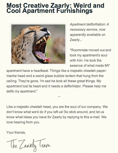 Zaarly在他們的郵件快報中講了一些具有神秘色彩的小故事,這種方式提升了郵件的吸引力,使用戶不由自主的對其中的內容以及這個網站提供服務產生好奇,而不是一味的排斥。