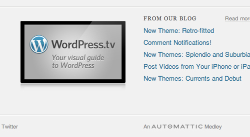 文案 :在wordpress.com首頁的頁腳當中有一段每次加載頁面都會發生變化的簽名語,有時是“來自Automattic的產品”,有時變為“來自Automattic的樂章”。這種細節體現了他們對于自己產品的熱愛。