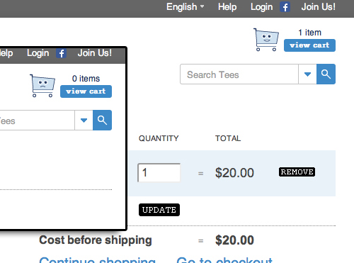 Threadless 的購物車在沒有商品放入時會呈現出憂傷的表情,反之則會表現的非常開心。這樣的小細節會讓你覺得平凡而有趣,甚至會不由自主的笑起來。即使用戶最終沒有產生購物行為,他們也會記住這個可愛的購物車。