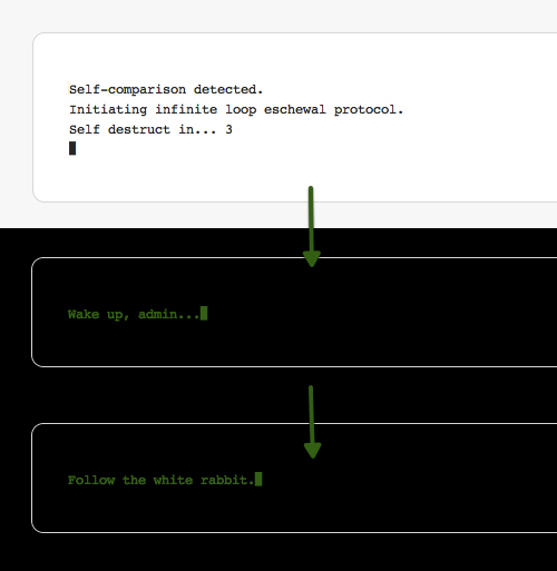 彩蛋 :在WordPress的self-comparison當中有個彩蛋。為了防止相同版本的文章進行自我比較,Automattic創建了一個小機制,無論是其中的文案還是視覺風格都模仿了黑客帝國當中的段子。這篇文章 會教你怎樣在WordPress當中找到這個彩蛋。