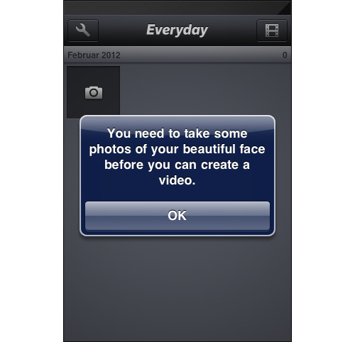 在"Everyday"應用當中,如果你還沒有向媒體庫中添加照片,那么系統就會非常友好的提示你去給自己“漂亮的臉蛋”拍些照片放到庫中——簡單的詞匯定義了提示信息甚至是產品的基調,換句話說,就是個性。