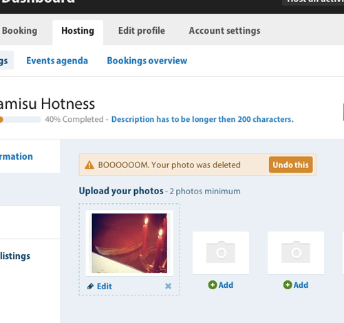 文案 :網站當中隨處可見簡短而幽默的文案,譬如“你好啊靚人!”、“嘭!你的照片被刪除了”等等。