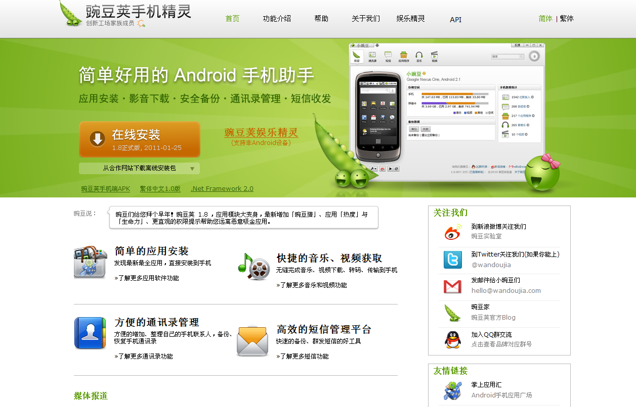 5 豌豆莢手機精靈官網,非常實用的應用軟件類布局,功能、關注、宣傳、友鏈布局合理,大大的焦點圖上書:在線安裝,用戶下載方便。該有的都有,所以在意料之中,相對平常。