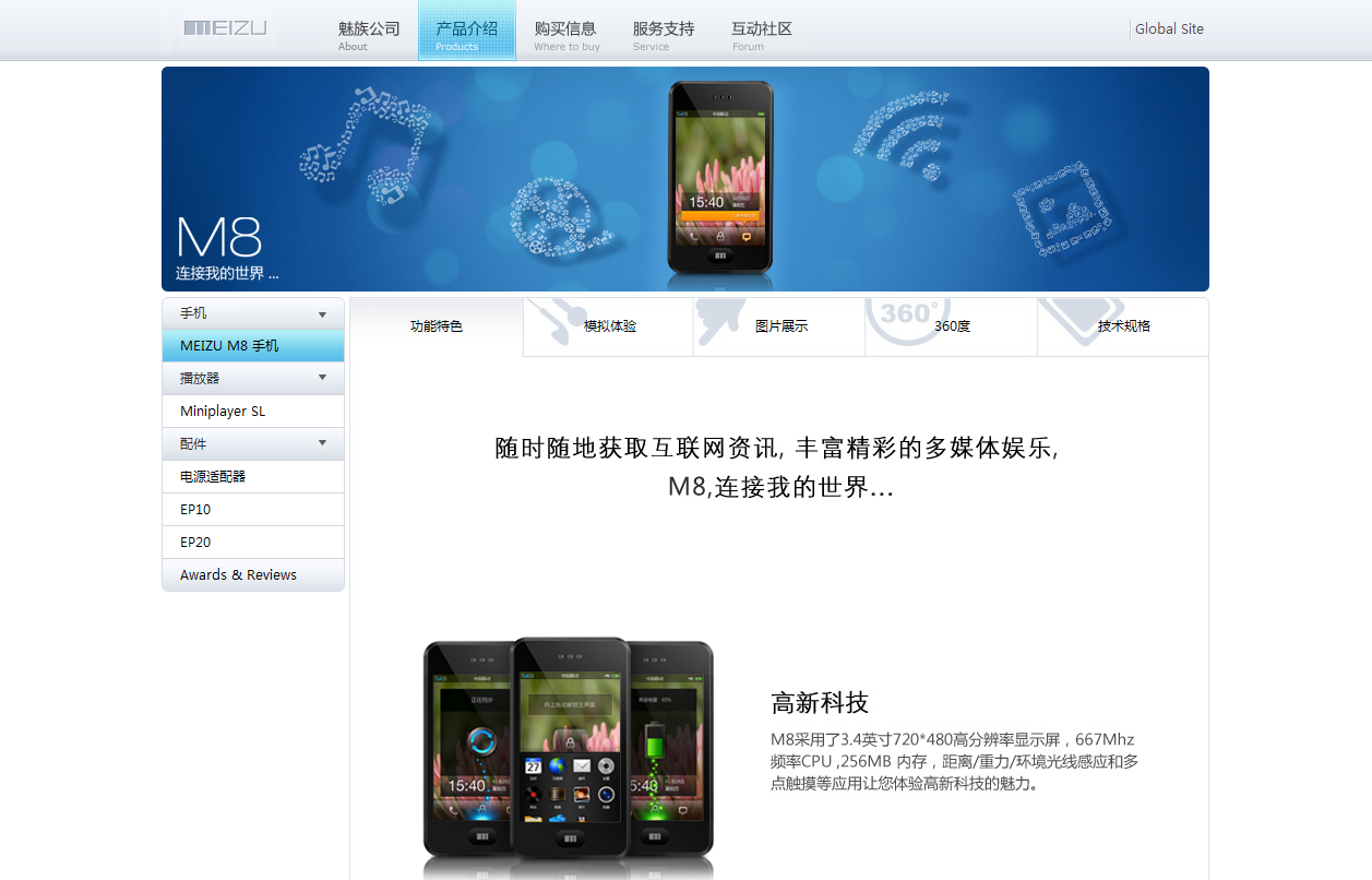 4 魅族公司官網,也是藍藍個人非常喜歡的風格,格局大方,恢宏穩重,沒有多余的東西,極簡單而條理清晰,重點的圖設計精致、表達需求明確,而且唯美,大量空白顯的頁面不擁擠,有想象的空間。