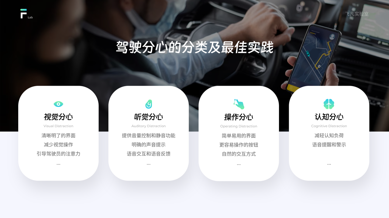 當駕駛員的思維或注意力被其他事物或任務占據時,就會發生認知分心。例如,擔心工作、家庭問題或沉思等。最佳實踐: