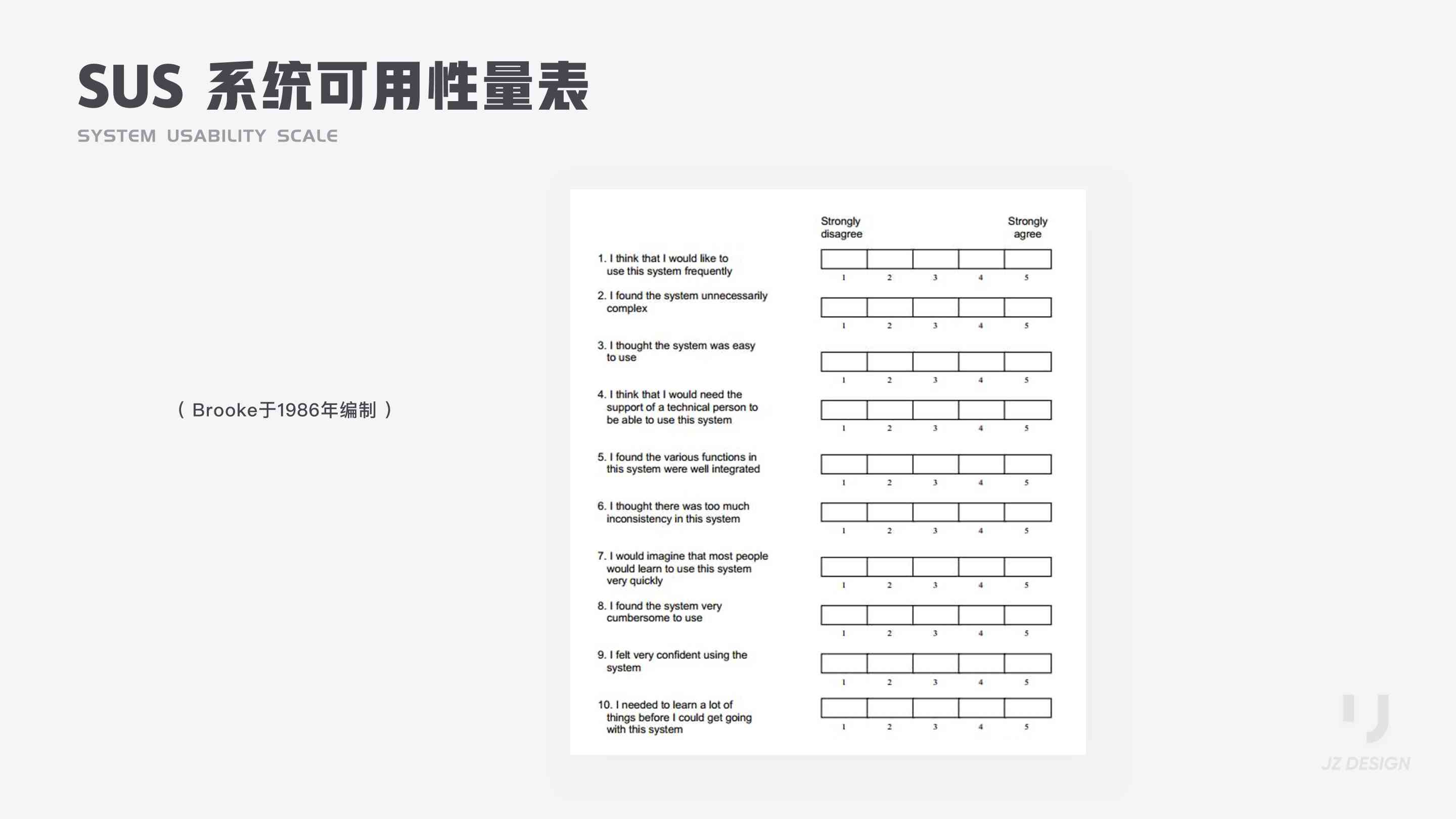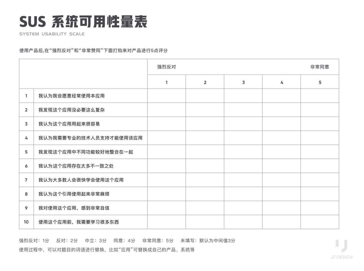 SUS 全稱 System Usability Scale ,系統可用性量表。SUS最初是Brooke于1986年編制,可以科學地量化用戶體驗,用于完成一系列任務場景后,對產品或系統整體宏觀的感知可用性測量。