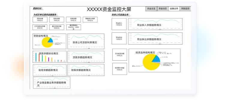 北京九恒星科技股份有限公司是一家企業資金管理軟件產品及企業金融信息增值服務的提供商,致力于通過信息技術的應用,幫助企業改善現金流;在金融機構與企業之間架起橋梁,讓企業的資金流更加順暢。大屏主要應用場景,公司會議,集團視察,行業參觀等。領導駕駛艙主要應用場景:財務公司各級領導日常運營決策查詢,公司會議等,是系統重要的展示功能,可作為系統特色功能或是門面,使用較為頻繁。