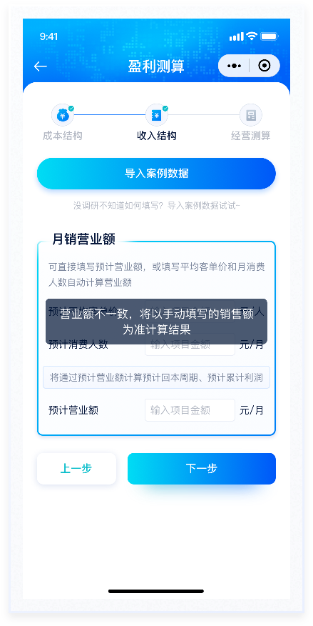 所盈利測算功能是產品的主要功能,通過AI對未來開店盈虧情況進行預測評估。本次設計主要優化該流程的交互及視覺表現,整個流程分為“成本結構”“收入結構”“經營測算”三個階段,過程填寫情況放置在頁面頂部,一步了然。已填寫使用主題色標注,未填寫則使用置灰顏色處理,符合用戶基本感知。按鈕使用與主色相近的漸變色。